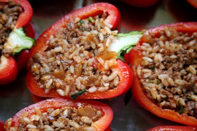 I made stuffed capsicum the other night. Here they are about to go into the oven. My mum would make them from peppers (the long horn shaped ones) my dad grew in the garden. There was always a point in the season where there would suddenly be an abundance of peppers and the best way to get through them was to stuff them. My mother in law also grows them and she actually makes the best stuffed peppers. Not that my mother’s weren’t delicious, they most certainly were. However, being Italian she mixed the mince with bread crumbs whereas my mother in law uses rice with her mince. This makes them healthier and in my opinion tastier. I base my recipe on my mother in law’s but I add touches from my mum’s. Like my mum I use fresh basil, parsley and bay leaves which I picked from my garden.