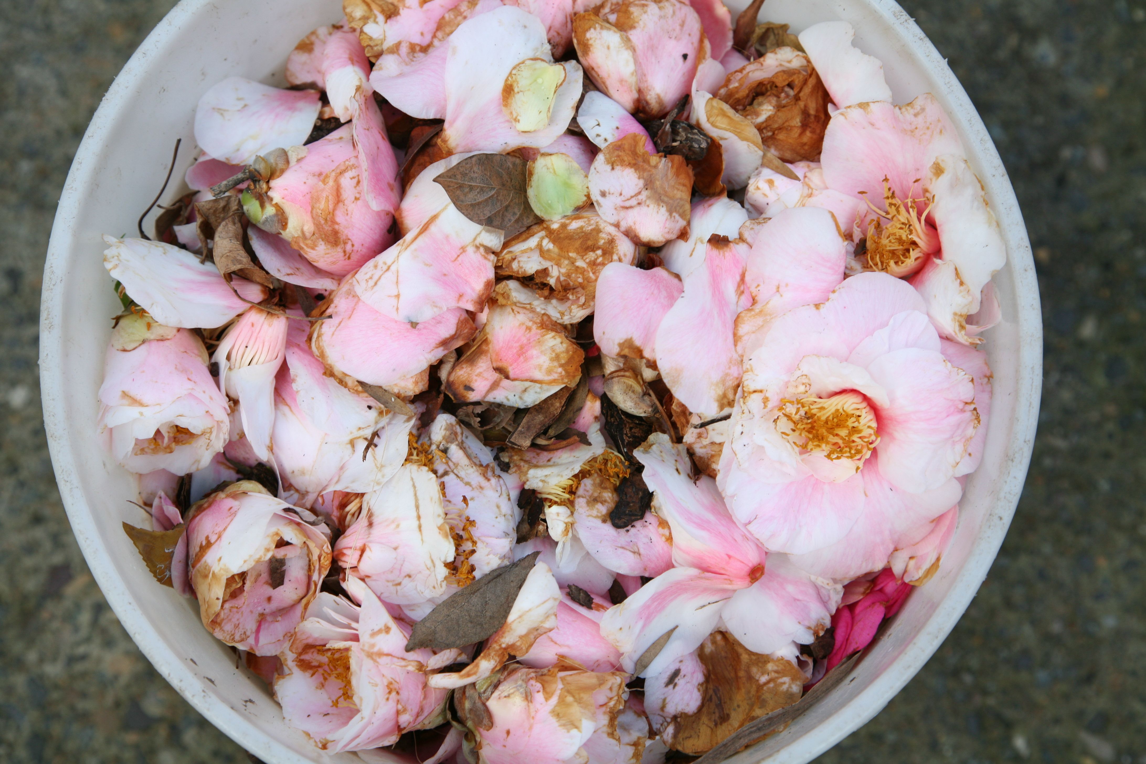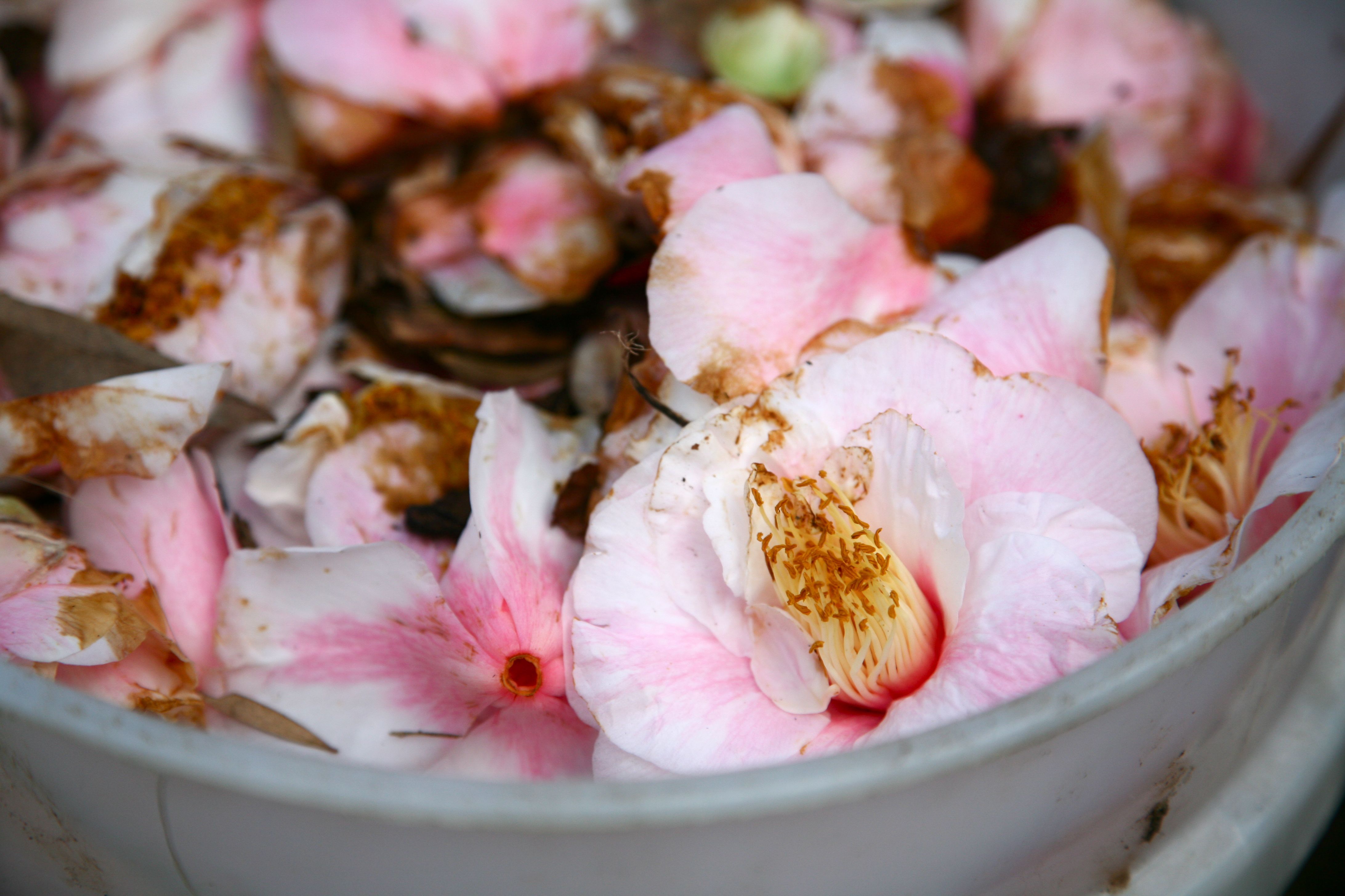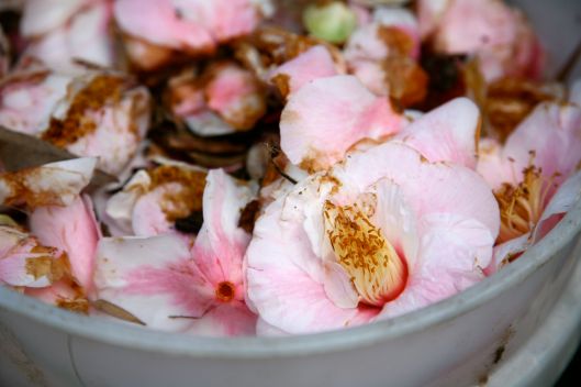 Last weekend Poppet and Baba swept up the front yard while I worked in my little garden. They returned with a large bucket of decaying Camellia flowers. They were just beautiful. Loads of pale pink and rust coloured soft petals. I decided to take photos. Poppet got caught up in my excitement and started to hover. First, he started to hang the peg basket on the handle of the bucket while I took close-ups. When Baba took the basket off him he started to lunge toward the bucket giggling and shouting ‘tip them over, tip them over, tip them over’. I admit it was tempting.